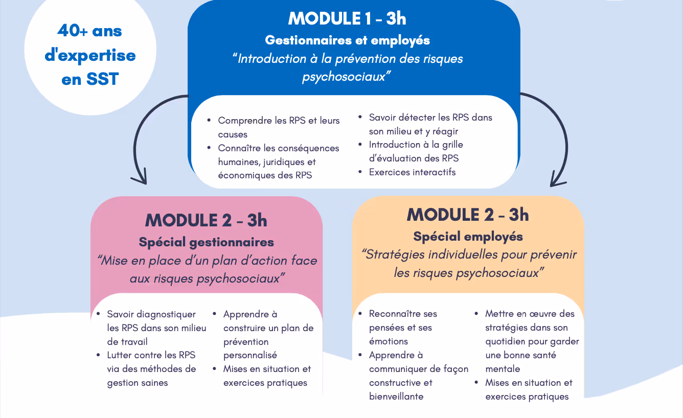 R : Tous les employeurs, ainsi que leurs gestionnaires et employés, sont concernés. La formation est conçue pour tous : module pour les gestionnaires et module pour les employés, afin qu’ils sachent reconnaître et réagir aux RPS.